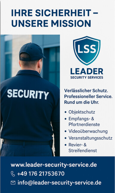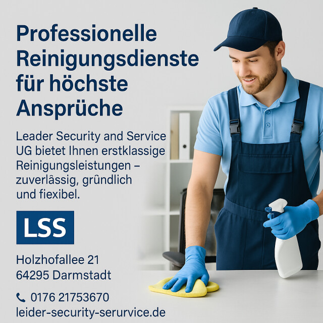 LSS Leader Security and Service, ansässig in Darmstadt, steht für Vielfalt und Qualität in den Bereichen Reinigung und Sicherheit. Unsere breite Palette an Dienstleistungen, von der Fenster- und Glasreinigung über Personenschutz bis hin zur Gebäudereinigung und Entrümpelung, bietet für jede Herausforderung eine professionelle Lösung. Wir richten unseren Fokus auf die individuellen Bedürfnisse unserer Kunden – ob privat oder gewerblich.