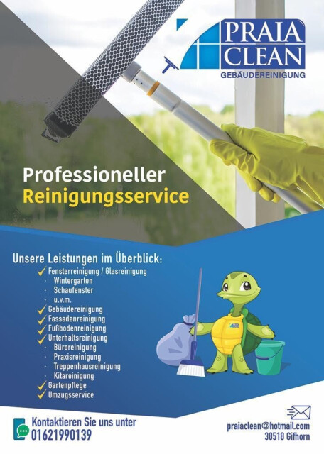 Im Herzen von Gifhorn gelegen, steht Praia Clean für Sauberkeit und Qualität in der Gebäudereinigung, Glasreinigung und Büroreinigung. Unsere Dienstleistungen erstrecken sich über die tägliche Unterhaltsreinigung bis hin zur spezialisierten Praxisreinigung. Mit einem Auge fürs Detail und dem Einsatz umweltfreundlicher Reinigungsmethoden versichern wir Ihnen höchste Standards.
